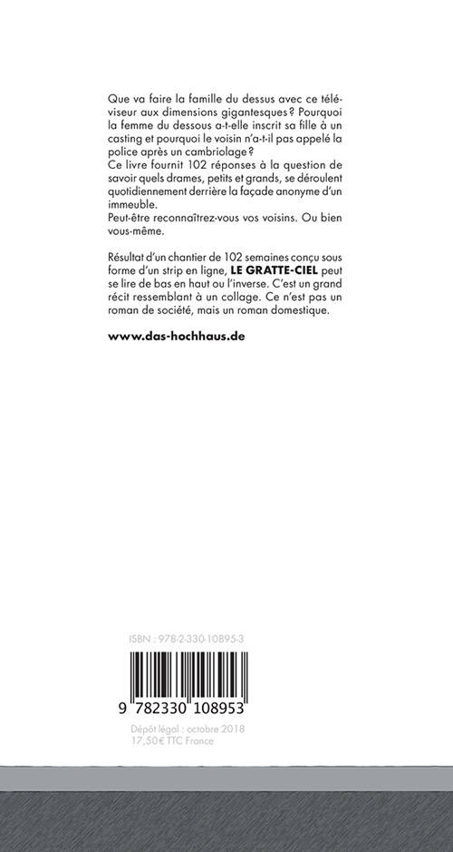 Du rez-de-chaussée jusqu'au 102e étage, une radiographie de la vie des habitants d'un gratte-ciel, avec une situation cocasse par étage. Le roman domestique de notre époque.