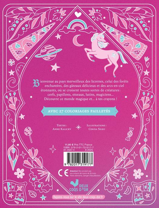 Bienvenue au pays merveilleux des licornes, celui des forêts enchantées, des gâteaux délicieux et des arcs-en-ciel étonnants, où se croisent toutes sortes de créatures : cerfs, papillons, oiseaux, lutins, magiciens... Découvre ce monde magique et... à tes crayons !
