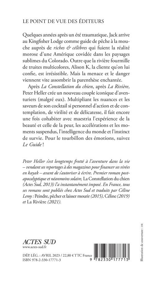 Quelques années après un été traumatique, Jack arrive au Kingfisher Lodge comme guide de pêche à la mouche auprès de "riches & célèbres" qui fuient la réalité morose d'une Amérique covidée dans les paysages sublimes du Colorado. Outre que la rivière fourmille de truites multicolores, Alison K, la cliente qu'on lui confie, est irrésistible. Mais la menace et le danger viennent vite assombrir la parenthèse enchantée. Après "La Constellation du chien", après "La Rivière", Peter Heller crée un nouveau couple iconique d'aventuriers (malgré eux). Multipliant les nuances et les saveurs de son cocktail si personnel d'action et de contemplation, de virilité et de délicatesse, il fait encore une fois cohabiter avec maestria l'expérience de la beauté et celle de la peur, les accélérations et les moments suspendus, l'intelligence du monde et l'instinct de survie. Pour le tourbillon des émotions, suivez "Le Guide" !