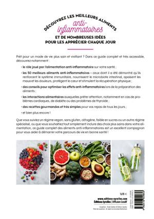 • les 50 meilleurs aliments anti-inflammatoires - ceux dont il a été démontré qu'ils renforcent le système immunitaire, nourrissent le microbiote intestinal, apaisent les maux et les douleurs, protègent le coeur et stimulent la récupération physique ;
