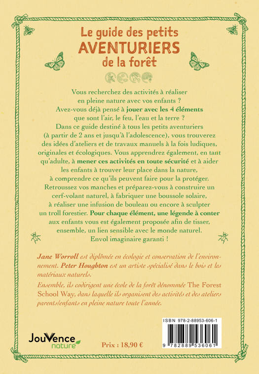 Vous recherchez des activités à réaliser en pleine nature avec vos enfants ? Avez-vous déjà pensé à jouer avec les 4 éléments que sont l’air, le feu, l’eau et la terre ? Dans ce guide destiné à tous les petits aventuriers (à partir de 2 ans et jusqu’à l’adolescence), vous trouverez des idées d’ateliers et de travaux manuels à la fois ludiques, originales et écologiques. Vous apprendrez également, en tant qu’adulte, à mener ces activités en toute sécurité et à aider les enfants à trouver leur place dans la nature, à comprendre ce qu’ils peuvent faire pour la protéger. Retroussez vos manches et préparez-vous à construire un cerf-volant naturel, à fabriquer une boussole solaire, à réaliser une nfusion de bouleau ou encore à sculpter un troll forestier. Pour chaque élément, une légende à conter aux enfants vous est également proposée afin de tisser, ensemble, un lien sensible avec le monde naturel. Envol imaginaire garanti !
