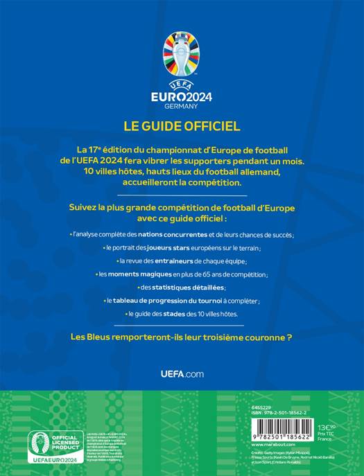 La 17e édition du championnat d’Europe de football de l’UEFA 2024 fera vibrer les supporters pendant un mois. 10 villes hôtes, hauts lieux du football allemand, accueilleront la compétition. Suivez la plus grande compétition de football d’Europe avec ce guide officiel : • l’analyse complète des nations concurrentes et de leurs chances de succès ; • le portrait des joueurs stars européens sur le terrain ; • la revue des entraîneurs de chaque équipe ; • les moments magiques en plus de 65 ans de compétition ; • des statistiques détaillées ; • le tableau de progression du tournoi à compléter ; • le guide des stades des 10 villes hôtes.