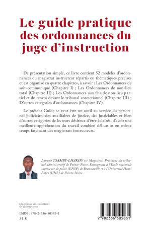 De présentation simple, ce livre contient 52 modèles d'ordonnances du magistrat instructeur répartis en thématiques précises et est organisé en quatre (4) chapitres, à savoir Les Ordonnances de soit-communiqué (Chapitre I); Les Ordonnances de non-lieu total (Chapitre II); Les Ordonnances aux fins de non-lieu partiel et de renvoi devant le tribunal correctionnel (Chapitre III); D'autres catégories d'ordonnances (Chapitre IV). Le présent Guide se veut être un outil au service du personnel judiciaire, des auxiliaires de justice, des justiciables et bien d'autres catégories de lecteurs désireux d'être éclairés, d'avoir une meilleure appréhension du travail combien délicat et en même temps fascinant des magistrats instructeurs.