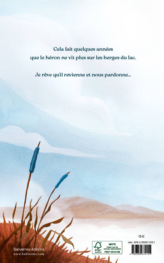Il y a longtemps, le héron bleu volait majestueusement sur le lac. Mais les hommes, cupides et ignorants, étaient envieux des poissons que le héron prélevait dans le lac et ils décidèrent de le chasser. Mais sans le héron, les poissons malades proliférèrent et bientôt, il n'y eut plus de poissons à pêcher. Je rêve qu'il revienne et nous pardonne...