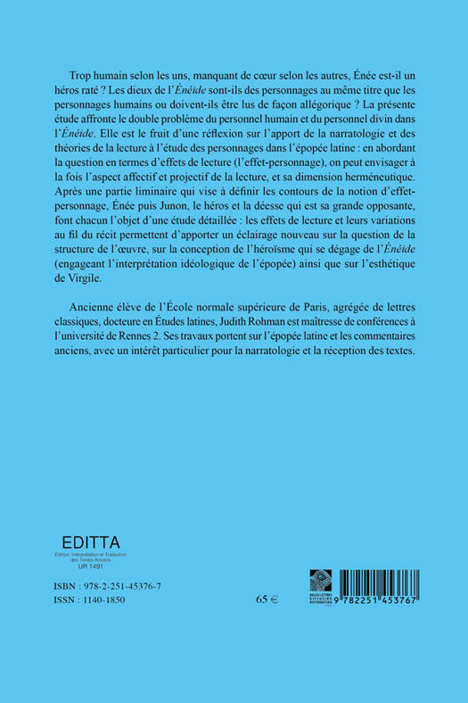 Trop humain selon les uns, manquant de coeur selon les autres, Enee est-il un heros rate ? Les dieux de l'Eneide sont-ils des personnages au meme titre que les personnages humains ou doivent-ils etre lus de facon allegorique? La presente etude affronte le double probleme du personnel humain et du personnel divin dans l'Eneide. Elle est le fruit d'une reflexion sur l'apport de la narratologie et des theories de la lecture a l'etude des personnages dans l'epopee latine: en abordant la question en termes d'effets de lecture (l'effet-personnage), on peut envisager a la fois l'aspect affectif et projectif de la lecture, et sa dimension hermeneutique. Apres une partie liminaire qui vise a definir les contours de la notion d'effetpersonnage, Enee puis Junon, le heros et la deesse qui est sa grande opposante, font chacun l'objet d'une etude detaillee: les effets de lecture et leurs variations au fil du recit permettent d'apporter un eclairage nouveau sur la question de la structure de l'oeuvre, sur la conception de l'heroisme qui se degage de l'Eneide (engageant l'interpretation ideologique de l'epopee) ainsi que sur l'esthetique de Virgile.