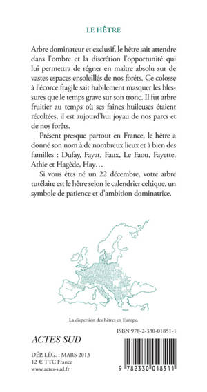 Arbre dominateur et exclusif, le hêtre sait attendre dans l'ombre et la discrétion l'opportunité qui lui permettra de régner en maître absolu sur de vastes espaces ensoleillés de nos forêts. Ce colosse à l'écorce fragile sait habilement masquer les blessures que le temps grave sur son tronc. Il fut arbre fruitier au temps où ses faînes huileuses étaient récoltées, il est aujourd'hui joyau de nos parcs et de nos forêts.