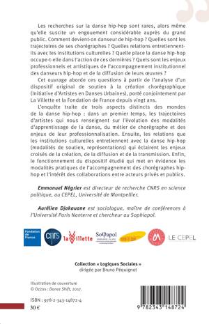Trois aspects distincts des mondes de la danse hip-hop sont abordés dans ce livre. Les trajectoires d'artistes nous renseignent sur les modalités d'apprentissage de la danse, du métier de chorégraphe et des enjeux de leur professionnalisation. Ensuite, les relations que les institutions culturelles entretiennent avec la danse hip-hop éclairent les enjeux de la création, de la diffusion et de la transmission. Enfin, le fonctionnement de ce dispositif met en évidence les modalités de l'accompagnement des chorégraphes hiphop et les collaborations entre acteurs privés et publics.