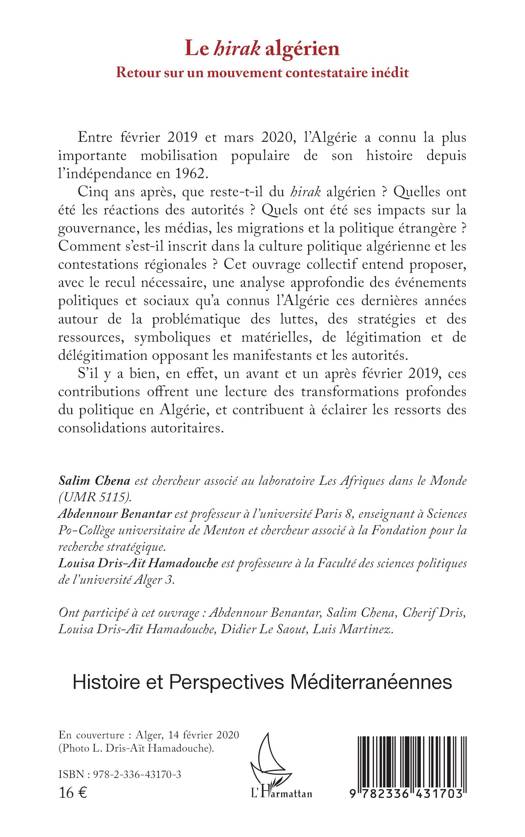 Entre février 2019 et mars 2020, l'Algérie a connu la plus importante mobilisation populaire de son histoire depuis l'indépendance en 1962. Cinq ans après, que reste-t-il du hirak algérien ? Quelles ont été les réactions des autorités ? Quels ont été ses impacts sur la gouvernance, les médias, les migrations et la politique étrangère ? Comment s'est-il inscrit dans la culture politique algérienne et les contestations régionales ? Cet ouvrage collectif entend proposer, avec le recul nécessaire, une analyse approfondie des événements politiques et sociaux qu'a connus l'Algérie ces dernières années autour de la problématique des luttes, des stratégies et des ressources, symboliques et matérielles, de légitimation et de délégitimation opposant les manifestants et les autorités. S'il y a bien, en effet, un avant et un après février 2019, ces contributions offrent une lecture des transformations profondes du politique en Algérie, et contribuent à éclairer les ressorts des consolidations autoritaires.