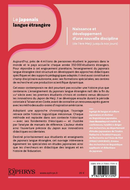 Ce tour d’horizon de l’histoire de l’enseignement du japonais en tant que langue étrangère présente le contexte historique qui a conduit les Japonais à mettre en place un enseignement de leur langue à des étrangers au tournant du xxe siècle. Il analyse les tâtonnements méthodologiques ainsi que les difficultés épistémologiques liées à la situation langagière singulière du Japon à la fin du xixe siècle (instauration tardive d’une langue commune, écart marqué entre les langues orale et écrite). Adoptant une approche chronologique, il retrace l’évolution des principales méthodes d’enseignement du japonais à des non-natifs, depuis la restauration de Meiji (1868) jusqu’au début des années 2000. Ces différentes approches sont présentées en fonction de leurs fondements théoriques, des contextes spécifiques ayant présidé à leur mise en place, ainsi que des supports d’apprentissage qui les accompagnaient.