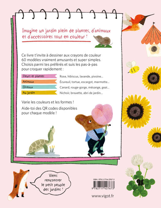 Ce livre t’invite à dessiner aux crayons de couleur 60 modèles vraiment amusants et super simples. Choisis parmi tes préférés et suis les pas-à-pas pour croquer rapidement : Fleurs et plantes : Rose, hibiscus, lavande, pivoine... Animaux : Écureuil, tortue, escargot, marmotte... Oiseaux : Canard, rouge-gorge, mésange, geai... Au jardin : Nichoir, brouette, abri de jardin...