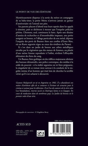 Ses parents placent d'abord tous leurs espoirs dans les appels à témoins, puis se déchirent à mesure que l'enquête policière piétine. L'homme, seul, continuera la lutte. Après une dizaine d'années de recherches et d'innombrables impasses, une petite araignée en bronze, et l'alliage particulier de son métal, déporte l'enquête des pavés de Buenos Aires aux confins d'Entre Ríos, où un Kurtz argentin règne au coeur des ténèbres du Paraná. Et c'est dans un jardin de bronze aux arbres métalliques envahis par la végétation que des statues de femmes, ou plutôt d'une même femme reproduite à l'infini, révèlent l'effroyable aliénation des liens du sang.