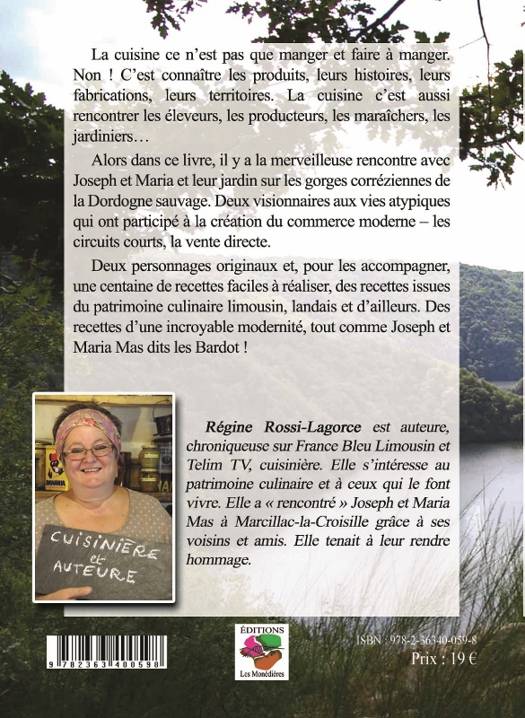La cuisine ce n’est pas que manger et faire à manger. Non ! C’est connaître les produits, leur histoire, leur fabrication, leur territoire. La cuisine c’est aussi rencontrer les éleveurs, les producteurs, les maraîchers, les jardiniers… Alors dans ce livre, il y a la merveilleuse rencontre avec Joseph et Maria et leur jardin sur les gorges corréziennes de la Dordogne sauvage. Deux visionnaires aux vies atypiques qui ont participé à la création du commerce moderne , les circuits courts, la vente directe. Deux personnages originaux et attachants ! Et pour les accompagner, une centaine de recettes faciles à réaliser, des recettes issues du patrimoine culinaire limousin, landais et d’ailleurs. Des recettes d’une incroyable modernité, tout comme Joseph et Maria Mas, dits les Bardot ! Que diriez-vous d’une soupe d’herbes sauvages, d’un ragoût de pomme de terre à la bruyère, et de fraises au serpolet… En cuisine ! A vous de jouer : avec Régine la cuisine est un jeu d’enfants et les papilles savourent !