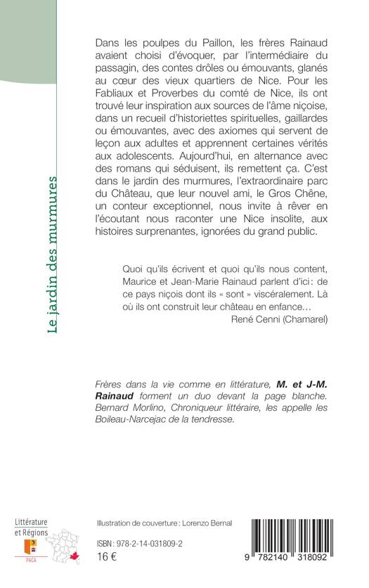 Dans les poulpes du Paillon, les frères Rainaud avaient choisi d'évoquer, par l'intermédiaire du passagin, des contes drôles ou émouvants, glanés au coeur des vieux quartiers de Nice. Pour les Fabliaux et Proverbes du comté de Nice, ils ont trouvé leur inspiration aux sources de l'âme niçoise, dans un recueil d'historiettes spirituelles, gaillardes ou émouvantes, avec des axiomes qui servent de leçon aux adultes et apprennent certaines vérités aux adolescents. Aujourd'hui, en alternance avec des romans qui séduisent, ils remettent ça. C'est dans le jardin des murmures, l'extraordinaire parc du Château, que leur nouvel ami, le Gros Chêne, un conteur exceptionnel, nous invite à rêver en l'écoutant nous raconter une Nice insolite, aux histoires surprenantes, ignorées du grand public.