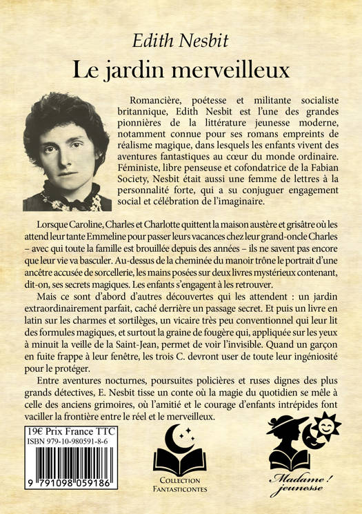 Lorsque Caroline, Charles et Charlotte quittent la maison austère et grisâtre où les attend leur tante Emmeline pour passer leurs vacances chez leur grand-oncle Charles – avec qui toute la famille est brouillée depuis des années – ils ne savent pas encore que leur vie va basculer. Au-dessus de la cheminée du manoir trône le portrait d’une ancêtre accusée de sorcellerie, les mains posées sur deux livres mystérieux contenant, dit-on, ses secrets magiques. Les enfants s’engagent à les retrouver. Mais ce sont d’abord d’autres découvertes qui les attendent : un jardin extraordinairement parfait, caché derrière un passage secret. Et puis un livre en latin sur les charmes et sortilèges, un vicaire très peu conventionnel qui leur lit des formules magiques, et surtout la graine de fougère qui, appliquée sur les yeux à minuit la veille de la Saint-Jean, permet de voir l’invisible. Quand un garçon en fuite frappe à leur fenêtre, les trois C. devront user de toute leur ingéniosité pour le protéger. Entre aventures nocturnes, poursuites policières et ruses dignes des plus grands détectives, E. Nesbit tisse un conte où la magie du quotidien se mêle à celle des anciens grimoires, où l’amitié et le courage d’enfants intrépides font vaciller la frontière entre le réel et le merveilleux.