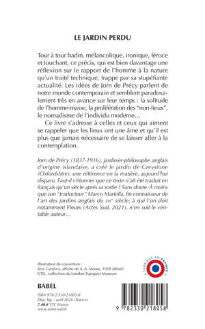 Tour à tour badin, mélancolique, ironique, féroce et touchant, ce précis, qui est bien davantage une réflexion sur le rapport de l'homme à la nature qu'un traité technique, frappe par sa stupéfiante actualité. Les idées de Jorn de Précy parlent de notre monde contemporain et semblent paradoxalement très en avance sur leur temps : la solitude de l'homme-masse, la prolifération des "non- lieux", le nomadisme de l'individu moderne... Ce livre s'adresse à celles et ceux qui aiment se rappeler que les lieux ont une âme et qu'il est plus que jamais nécessaire de se laisser aller à la contemplation.