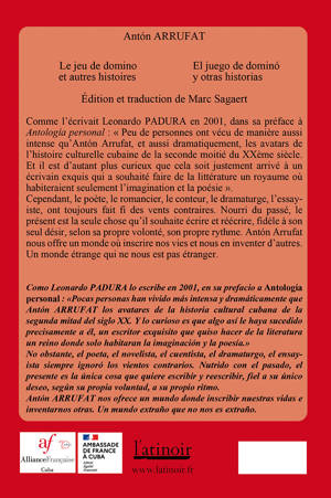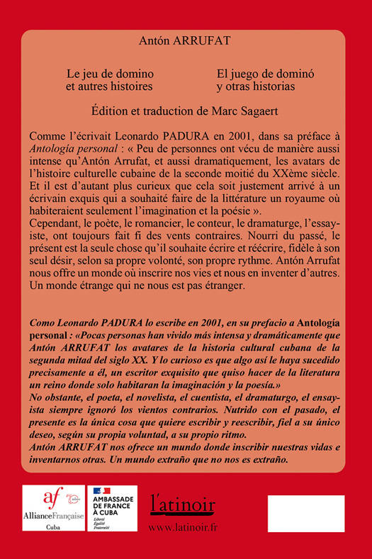 Poète, romancier, dramaturge, essayiste, académicien, Antón ARRUFAT, couronné par de nombreux prix littéraires, a été salué plusieurs fois par Leonardo PADURA. L'atinoir a publié en avril 2022 l'ouvrage bilingue : Fracture et autres histoires / Fractura y otras historias, Ce nouvel ouvrage bilingue, intitulé Le Jeu de domino et autres histoires / El Juego de domino y otras historias, réunit également une dizaine de textes dont deux remarquables essais, l'un sur José LEZAMA LIMA, l'autre sur Virgilio PIÑERA. Ces récits et ces proses de nature et longueur variées mêlent rêveries et souvenirs, humour et fantaisie, fiction et réflexion. Comme l'écrivait Leonardo PADURA en 2001, dans sa préface à Antología personal : « peu de personnes ont vécu de manière aussi intense qu'Antón Arrufat, et aussi dramatiquement, les avatars de l'histoire culturelle cubaine de la seconde moitié du XXème siècle. Et il est d'autant plus curieux que cela soit justement arrivé à un écrivain exquis qui a souha