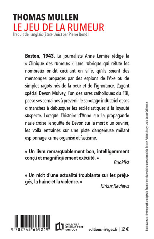 Une journaliste déterminée et un agent du FBI récalcitrant affrontent des éléments fascistes dans ce thriller historique qui se déroule à Boston durant la Seconde Guerre mondiale. Une nouvelle saga de Thomas Mullen dans la veine de la trilogie d'Atlanta, qui aborde cette fois-ci l'antisémitisme et les fake news.