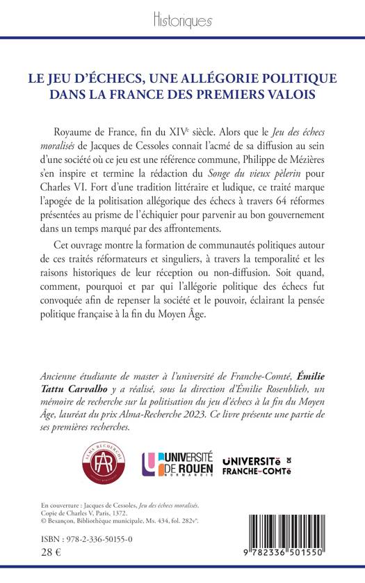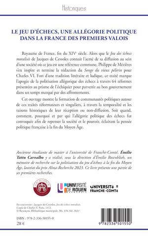 Royaume de France, fin du xive siècle. Alors que le Jeu des échecs moralisés de Jacques de Cessoles connait l'acmé de sa diffusion au sein d'une société où ce jeu est une référence commune, Philippe de Mézières s'en inspire et termine la rédaction du Songe du vieux pèlerin pour Charles VI. Fort d'une tradition littéraire et ludique, ce traité marque l'apogée de la politisation allégorique des échecs à travers 64 réformes présentées au prisme de l'échiquier pour parvenir au bon gouvernement dans un temps marqué par des affrontements. Cet ouvrage montre la formation de communautés politiques autour de ces traités réformateurs et singuliers, à travers la temporalité et les raisons historiques de leur réception ou non-diffusion. Soit quand, comment, pourquoi et par qui l'allégorie politique des échecs fut convoquée afin de repenser la société et le pouvoir, éclairant la pensée politique française à la fin du Moyen Âge.