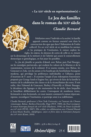 Le Jeu des familles se penche d'abord, avec Balzac puis Paul Bourget, sur les nostalgies patriarcales, qui exaltent les valeurs de la filiation et de la transmission, vecteurs de la mêmeté. Il se tourne ensuite, avec Balzac, les Goncourt et Zola, vers les atouts et les handicaps du familialisme bourgeois moderne, qui privilégie les préférences individuelles et l'alliance, point d'insertion de l'« autre ». Il examine l'utopie dune rédemption fraternitaire proposée par George Sand et Eugène Sue, qui rêvent de faire de la famille la matrice de la cohabitation des classes et de la réconciliation des sexes. Il suit enfin, chez Edmond de Goncourt, Barbey d'Aurevilly et Elémir Bourges, la décadence des lignages et des maisonnées fin de siècle, dans lesquelles se brouillent délibérément les cartes. Convoquant de nombreux textes, fictionnels et non fictionnels, cet essai montre comment le roman répercute, repense, reconfigure l'institution, et participe ainsi à sa redéfinition.