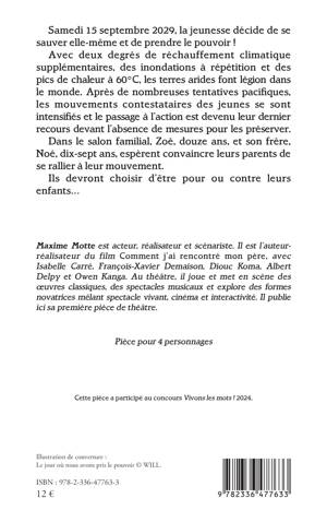 Samedi 15 septembre 2029, la jeunesse décide de se sauver elle-même et de prendre le pouvoir ! Avec deux degrés de réchauffement climatique supplémentaires, des inondations à répétition et des pics de chaleur à 60°C, les terres arides font légion dans le monde. Après de nombreuses tentatives pacifiques, les mouvements contestataires des jeunes se sont intensifiés et le passage à l'action est devenu leur dernier recours devant l'absence de mesures pour les préserver. Dans le salon familial, Zoé, douze ans, et son frère, Noé, dix-sept ans, espèrent convaincre leurs parents de se rallier à leur mouvement. Ils devront choisir d'être pour ou contre leurs enfants...