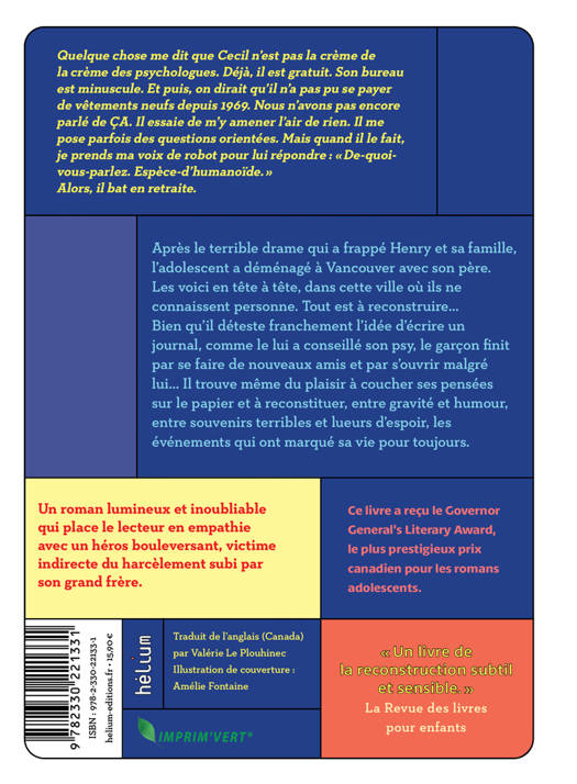 Après le terrible drame qui a frappé Henry et sa famille, et les conséquences qui en ont découlé, l'adolescent a déménagé à Vancouver avec son père. Les voici en tête à tête, dans cette ville où ils ne connaissent personne. Tout est à reconstruire... Bien qu'il déteste franchement l'idée d'écrire un journal, comme le lui a conseillé son psy, le garçon finit par se faire des nouveaux amis et par s'ouvrir malgré lui... Au fil des jours, il trouve même du plaisir à coucher ses pensées sur le papier et à reconstituer, entre gravité et humour, entre souvenirs terribles et lueurs d'espoir, les événements qui ont marqué sa vie pour toujours.