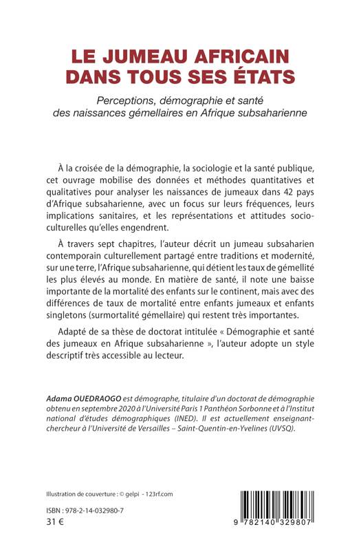 À la croisée de la démographie, la sociologie et la santé publique, cet ouvrage mobilise des données et méthodes quantitatives et qualitatives pour analyser les naissances de jumeaux dans 42 pays d'Afrique subsaharienne, avec un focus sur leurs fréquences, leurs implications sanitaires, et les représentations et attitudes socioculturelles qu'elles engendrent. À travers sept chapitres, l'auteur décrit un jumeau subsaharien contemporain culturellement partagé entre traditions et modernité, sur une terre, l'Afrique subsaharienne, qui détient les taux de gémellité les plus élevés au monde. En matière de santé, il note une baisse importante de la mortalité des enfants sur le continent, mais avec des différences de taux de mortalité entre enfants jumeaux et enfants singletons (surmortalité gémellaire) qui restent très importantes. Adapté de sa thèse de doctorat intitulé Démographie et santé des jumeaux en Afrique subsaharienne, l'auteur adopte un style descriptif très accessible au lecteur.