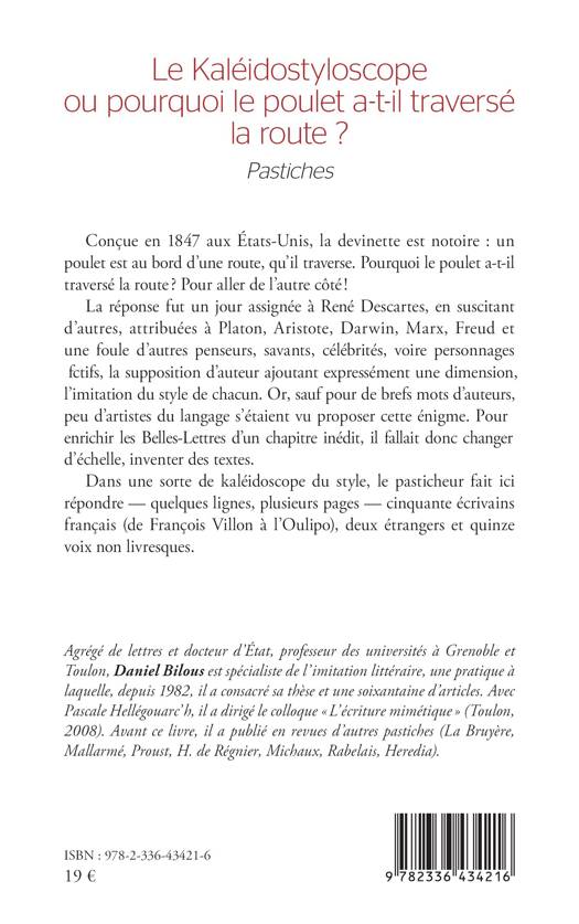 Conçue en 1847 aux États-Unis, la devinette est notoire un poulet est au bord d'une route, qu'il traverse. Pourquoi le poulet a-t-il traversé la route ? Pour aller de l'autre côté ! La réponse fut un jour assignée à René Descartes, en suscitant d'autres, attribuées à Platon, Aristote, Darwin, Marx, Freud et une foule d'autres penseurs, savants, célébrités, voire personnages fictifs, la supposition d'auteur ajoutant expressément une dimension, l'imitation du style de chacun. Or, sauf pour de brefs mots d'auteurs, peu d'artistes du langage s'étaient vus proposer cette énigme. Pour enrichir les Belles-Lettres d'un chapitre inédit, il fallait donc changer d'échelle, inventer des textes. Dans une sorte de kaléidoscope du style, le pasticheur fait ici répondre - quelques lignes, plusieurs pages - cinquante écrivains français (de François Villon à l'Oulipo), deux étrangers et quinze voix non livresques.
