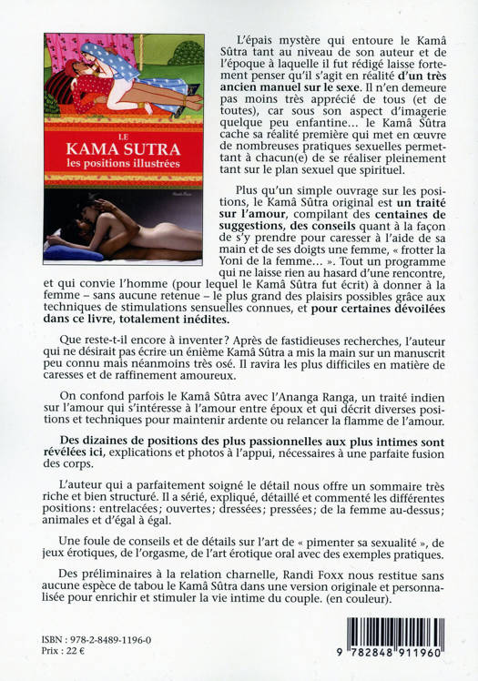 Plus qu'un simple ouvrage sur les positions, le Kamâ Sûtra original est un traité sur l'amour, compilant des centaines de suggestions, des conseils quant à la façon de s'y prendre pour caresser à l'aide de sa main et de ses doigts une femme. Que reste-t-il encore à inventer ? Après de fastidieuses recherches, l'auteur qui ne désirait pas écrire un énième Kamâ Sûtra a mis la main sur un manuscrit peu connu mais néanmoins très osé. Il ravira les plus difficiles en matière de caresses et de raffinement amoureux. Des dizaines de positions des plus passionnelles aux plus intimes sont révélées ici, explications et photos à l'appui, nécessaires à une parfaite fusion des corps. L'auteur qui a parfaitement soigné le détail nous offre un sommaire très riche et bien structuré. Il a sérié, expliqué, détaillé et commenté les différentes positions : entrelacées ; ouvertes ; dressées ; pressées ; de la femme au-dessus ; animales et d'égal à égal. Une foule de conseils et de détails sur l'art de " pimenter sa sexualité ", de jeux érotiques, de l'orgasme, de l'art érotique oral avec des exemples pratiques. Des préliminaires à la relation charnelle, Randi Foxx nous restitue sans aucune espèce de tabou le Kamâ Sûtra dans une version originale et personnalisée pour enrichir et stimuler la vie intime du couple.