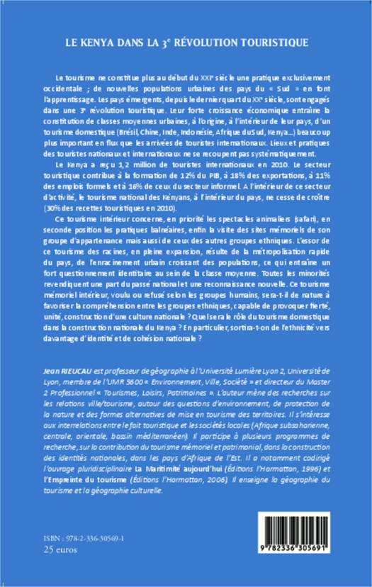Le tourisme ne constitue plus au début du XXIè siècle une pratique exclusivement occidentale; de nouvelles populations urbaines des pays du "Sud" en font l'apprentissage. Les pays émergents sont engagés dans une 3è révolution touristique. Le tourisme national des Kényans, à l'intérieur du pays, ne cesse de croître. Ce tourisme sera-t-il de nature à favoriser la compréhension entre les groupes ethniques, capable de provoquer fierté, unité, construction d'une culture nationale ? (Articles en français et en anglais).