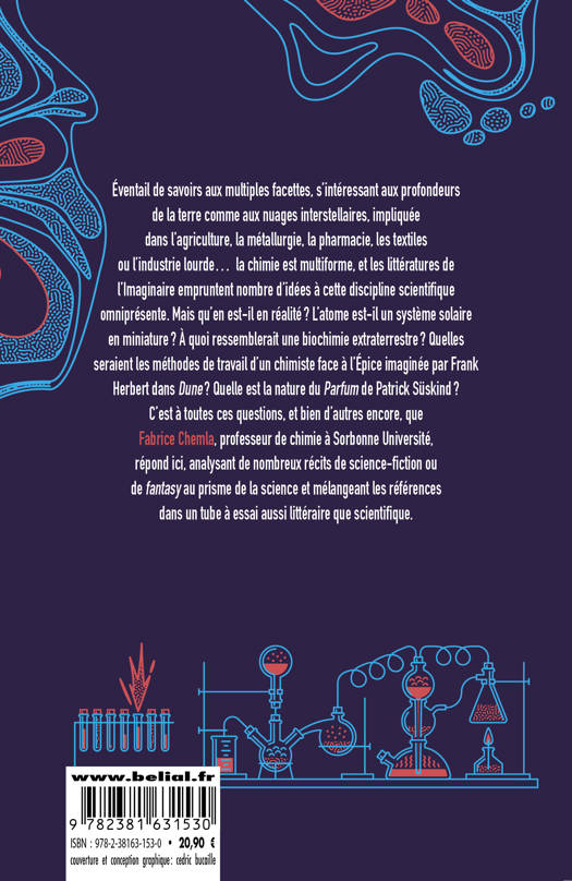 Éventail de savoirs aux multiples facettes, s'intéressant aux profondeurs de la terre comme aux nuages interstellaires, impliquée dans l'agriculture, la métallurgie, la pharmacie, les textiles ou l'industrie lourde... la chimie est multiforme, et les littératures de l'imaginaire empruntent nombre d'idées à cette discipline scientifique omniprésente. Mais qu'en est-il en réalité ? L'atome est-il un système solaire en miniature ? À quoi ressemblerait une biochimie extraterrestre ? Quelles seraient les méthodes de travail d'un chimiste face à l'Épice imaginée par Frank Herbert dans Dune ? Quelle est la nature du Parfum de Patrick Süskind ?