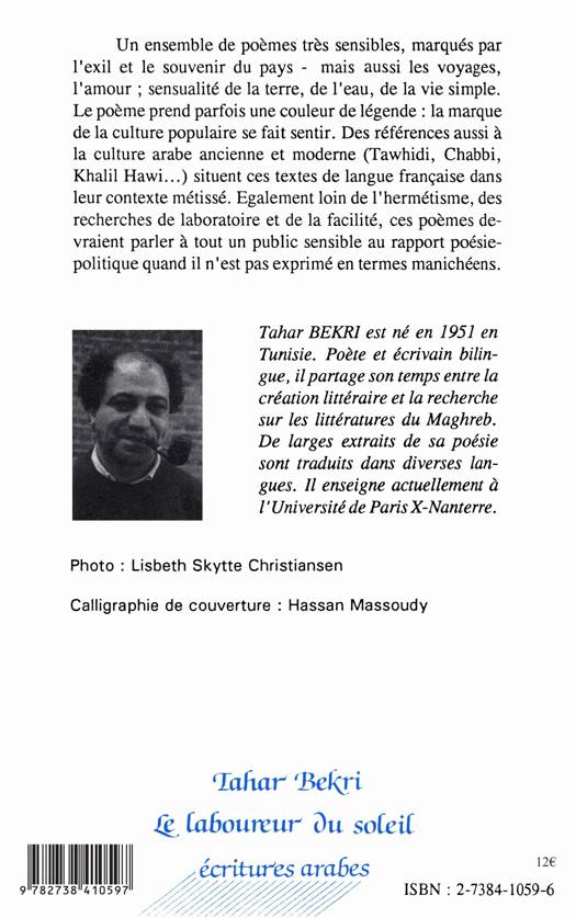 Un ensemble de poèmes très sensibles, marqués par l'exil et le souvenir du pays - mais aussi les voyages, l'amour ; sensualité de la terre, de l'eau, de la vie simple. Le poème prend parfois une couleur de légende : la marque de la culture populaire se fait sentir. Des références aussi à la culture arabe ancienne et moderne (Tawhidi, Chabbi, Khalil Hawi ... ) situent ces textes de langue française dans leur contexte métissé. Egalement loin de l'hermétisme, des· recherches de laboratoire et de la facilité, ces poèmes devraient parler à tout un public sensible au rapport poésiepolitique quand il n'est pas exprimé en termes manichéens.
