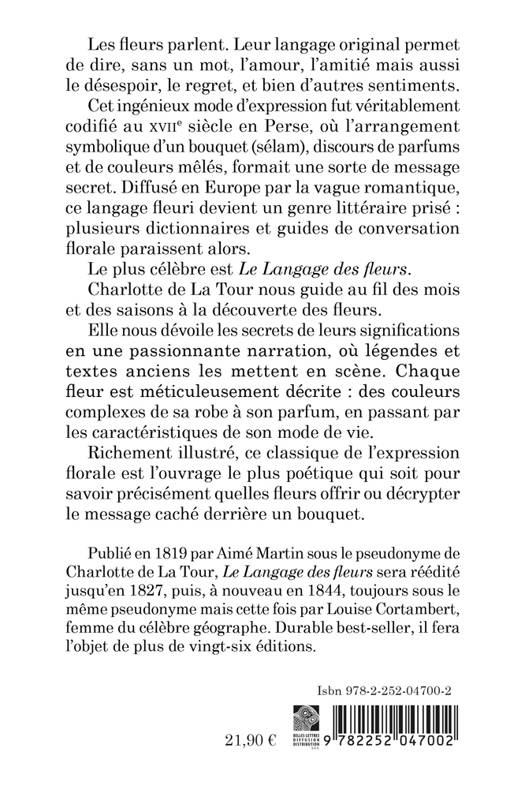 Les fleurs parlent. Leur langage original permet de dire, sans un mot, l'amour, l'amitie mais aussi le desespoir, le regret, et bien d'autres sentiments. Cet ingenieux mode d'expression fut veritablement codifie au xviie siecle en Perse, ou l'arrangement symbolique d'un bouquet (selam), discours de parfums et de couleurs meles, formait une sorte de message secret. Diffuse en Europe par la vague romantique, ce langage fleuri devient un genre litteraire prise: plusieurs dictionnaires et guides de conversation florale paraissent alors. Le plus celebre est Le Langage des fleurs. Charlotte de La Tour nous guide au fil des moiset des saisons a la decouverte des fleurs. Elle nous devoile les secrets de leurs significations en une passionnante narration, ou legendes et textes anciens les mettent en scene. Chaque fleur est meticuleusement decrite: des couleurs complexes de sa robe a son parfum, en passant par les caracteristiques de son mode de vie. Richement illustre, ce classique de l'expression florale est l'ouvrage le plus poetique qui soit pour savoir precisement quelles fleurs offrir ou decrypter le message cache derriere un bouquet. Publie en 1819 par Aime Martin sous le pseudonyme de Charlotte de La Tour, Le Langage des fleurs sera reedite jusqu'en 1827, puis, a nouveau en 1844, toujours sous le meme pseudonyme mais cette fois par Louise Cortambert, femme du celebre geographe. Durable best-seller, il fera l'objet de plus de vingt-six editions.