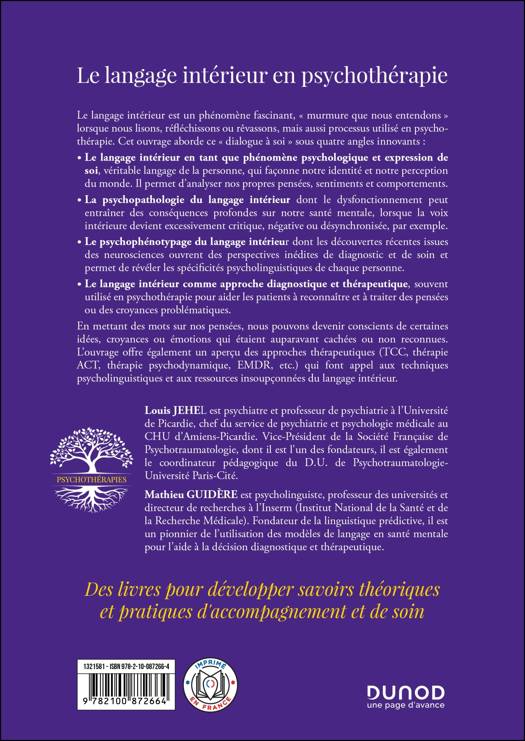 En mettant des mots sur nos pensées, nous pouvons devenir conscients de certaines idées, croyances ou émotions qui étaient auparavant cachées ou non reconnues. L’ouvrage offre également un aperçu des approches thérapeutiques (TCC, thérapie ACT, thérapie psychodynamique, EMDR, etc.) qui font appel aux techniques psycholinguistiques et aux ressources insoupçonnées du langage intérieur.
