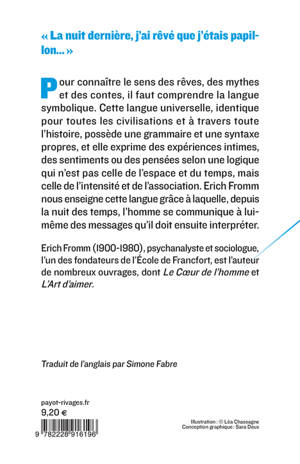 Pour connaître le sens des rêves, des mythes et des contes, il faut comprendre la langue symbolique. Cette langue universelle, identique pour toutes les civilisations et à travers toute l'histoire, possède une grammaire et une syntaxe propres, et elle exprime des expériences intimes, des sentiments ou des pensées selon une logique qui n'est pas celle de l'espace et du temps, mais celle de l'intensité et de l'association. Erich Fromm nous enseigne cette langue grâce à laquelle, depuis la nuit des temps, l'homme se communique à lui-même des messages qu'il doit ensuite interpréter.
