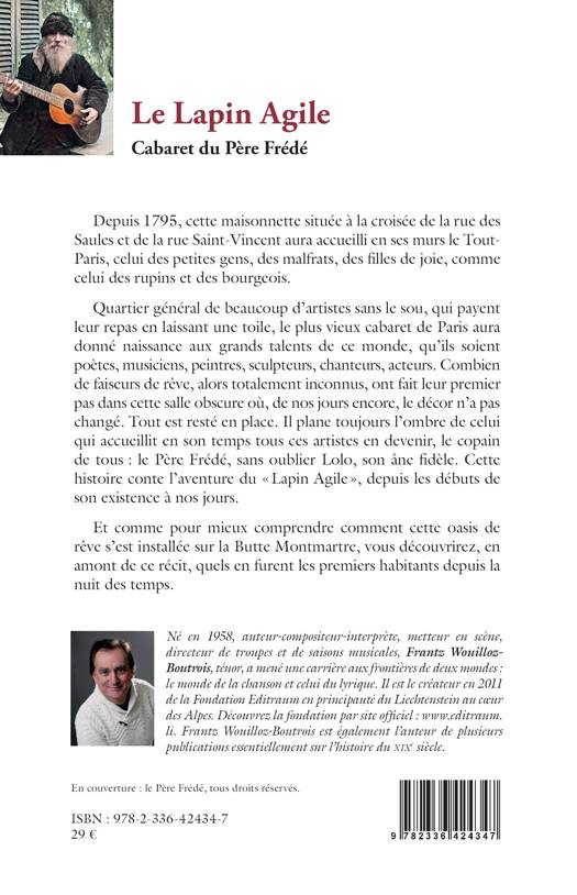 Depuis 1795, cette maisonnette située à la croisée de la rue des Saules et de la rue Saint-Vincent aura accueilli en ses murs le Tout-Paris, celui des petites gens, des malfrats, des filles de joie, comme celui des rupins et des bourgeois. Quartier général de beaucoup d’artistes sans le sou, qui payent leur repas en laissant une toile, le plus vieux cabaret de Paris aura donné naissance aux grands talents de ce monde, qu’ils soient poètes, musiciens, peintres, sculpteurs, chanteurs, acteurs. Combien de faiseurs de rêve, alors totalement inconnus, ont fait leur premier pas dans cette salle obscure où, de nos jours encore, le décor n’a pas changé. Tout est resté en place. Il plane toujours l’ombre de celui qui accueillit en son temps tous ces artistes en devenir, le copain de tous : le Père Frédé, sans oublier Lolo, son âne fidèle. Cette histoire conte l’aventure du « Lapin Agile », depuis les débuts de son existence à nos jours. Et comme pour mieux comprendre comment cette oasis de rêve s’est installée sur la Butte Montmartre, vous découvrirez, en amont de ce récit, quels en furent les premiers habitants depuis la nuit des temps.