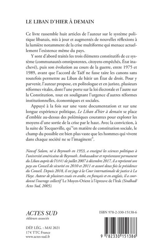 Ce livre rassemble huit articles de l'auteur sur le système politique libanais, mis à jour et augmentés de nouvelles réflexions à la lumière notamment de la crise multiforme qui menace actuellement l'existence même du pays. Y sont d'abord traités les trois éléments constitutifs de ce système (communautés omnipotentes, citoyens empêchés, État inachevé), puis son évolution au cours de la guerre, entre 1975 et 1989, avant que l'accord de Taëf ne fasse taire les canons sans toutefois permettre au Liban de bâtir un État de droit. Pour y parvenir, l'auteur propose, en politologue et en juriste, plusieurs réformes vitales, dont l'une porte sur la loi électorale et l'autre sur la Constitution, tout en soulignant l'urgence d'autres réformes institutionnelles, économiques et sociales. Appuyé à la fois sur une vaste documentation et sur une longue expérience politique, Le Liban d'hier à demain se place d'emblée au-d essus des polémiques courantes pour explorer les moyens d'une sortie de la crise par le haut. Avec la conviction, à la suite de Tocqueville, qu'"en matière de constitution sociale, le champ du possible est bien plus vaste que les hommes qui vivent dans chaque soci été ne se l'imaginent".