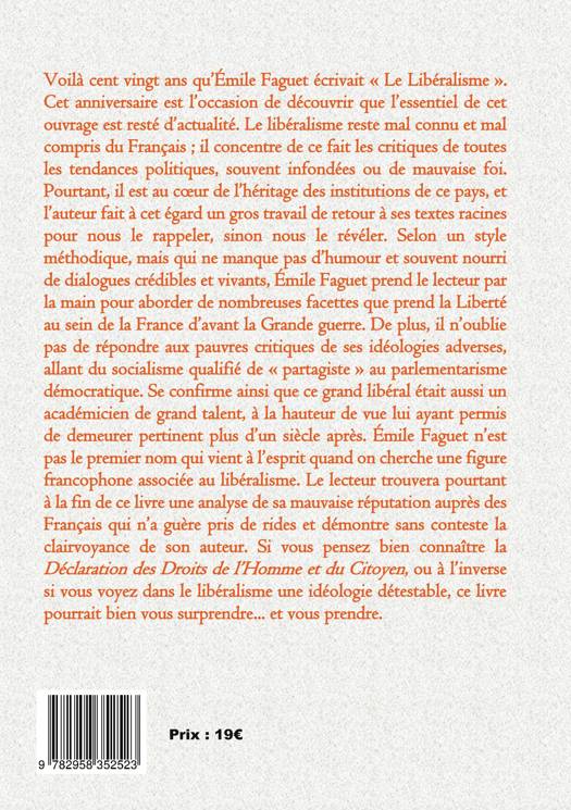 Voilà cent vingt ans qu'Émile Faguet écrivait « Le Libéralisme ». Cet anniversaire est l'occasion de découvrir que l'essentiel de cet ouvrage est resté d'actualité. Le libéralisme reste mal connu et mal compris du Français ; il concentre de ce fait les critiques de toutes les tendances politiques, souvent infondées ou de mauvaise foi. Pourtant, il est au coeur de l'héritage des institutions de ce pays, et l'auteur fait à cet égard un gros travail de retour à ses textes racines pour nous le rappeler, sinon nous le révéler. Selon un style méthodique, mais qui ne manque pas d'humour et souvent nourri de dialogues crédibles et vivants, Émile Faguet prend le lecteur par la main pour aborder de nombreuses facettes que prend la Liberté au sein de la France d'avant la Grande guerre. De plus, il n'oublie pas de répondre aux pauvres critiques de ses idéologies adverses, allant du socialisme qualifié de « partagiste » au parlementarisme démocratique. Se confirme ainsi que ce grand libéral était aussi un académicien de grand talent, à la hauteur de vue lui ayant permis de demeurer pertinent plus d'un siècle après. Émile Faguet n'est pas le premier nom qui vient à l'esprit quand on cherche une figure francophone associée au libéralisme. Le lecteur trouvera pourtant à la fin de ce livre une analyse de sa mauvaise réputation auprès des Français qui n'a guère pris de rides et démontre sans conteste la clairvoyance de son auteur. Si vous pensez bien connaître la Déclaration des droits de l'homme, ou à l'inverse si vous voyez dans le libéralisme une idéologie détestable, ce livre pourrait bien vous surprendre et vous prendre.