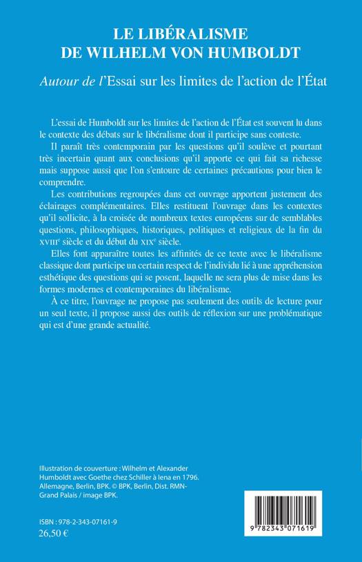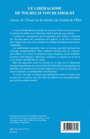 L'essai de Humboldt sur les limites de l'action de l'État est souvent lu dans le contexte des débats sur le libéralisme dont il participe sans conteste. Il paraît très contemporain par les questions qu'il soulève et pourtant très incertain quant aux conclusions qu'il apporte. Ces contributions apportent des éclairages complémentaires, elles se situent à la croisée de nombreux textes européens sur de semblables questions, philosophiques, historiques, politiques et religieux de la Fin du XVIIIe siècle et du début du XIXe siècle.