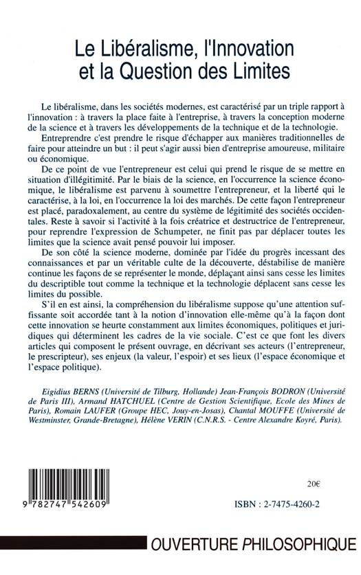 La compréhension du libéralisme suppose qu'une attention suffisante soit accordée tant à la notion d'innovation elle-même qu'à la façon dont cette innovation se heurte constamment aux limites économiques, politiques et juridiques qui déterminent la vie sociale. C'est ce que font les divers articles qui composent le présent ouvrage, en décrivant ses acteurs (l'entrepreneur, le prescripteur), ses enjeux (la valeur, l'espoir) et ses lieux (l'espace économique et l'espace politique).