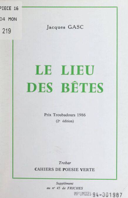Comme beaucoup de poètes, Jacques Gasc se penche ici sur son enfance. Une enfance méditerranéenne, aux confins de Languedoc et de Provence, un pays où « les coqs ruissellent de tout leur jabot » tandis que « le croissant des cornes (du taureau) trace le silence envoûté de l’arène ». Mais « Le lieu des bêtes » dépasse l’anecdote d’un vécu, et c’est surtout une écriture que le jury du prix Troubadours a voulu distinguer ici. L’auteur maîtrise parfaitement le langage poétique : son sens de la métaphore et du rythme n’est jamais pris en défaut. Jouant de la langue, comme un danseur de son corps, il nous entraîne au cœur d’un pays mais, plus encore, au cœur d’une mémoire où le lecteur se re-connaît.
