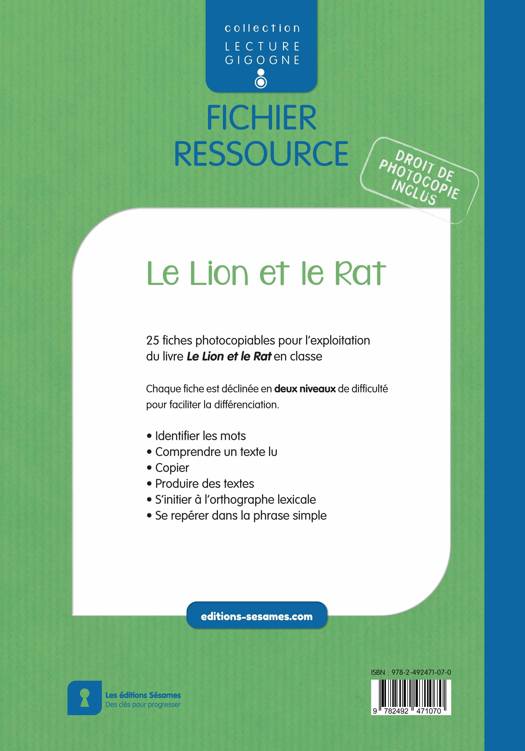 25 fiches photocopiables pour l'exploitation du livre Le Lion et le Rat en classe