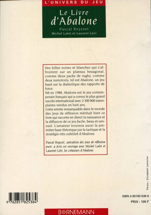 Des billes noires et blanches qui s'affrontent sur un plateau hexagonal, comme deux packs de rugby, comme deux sumotoris, tel est Abalone, un jeu basé sur la dialectique des rapports de force. Né en 1988, Abalone est le jeu contemporain français qui a connu le plus grand succès international avec 2 300 000 exemplaires vendus en huit ans. Cette entrée remarquable dans le monde des jeux de réflexion méritait bien ce livre qui raconte en direct la naissance et la diffusion de ce jeu facile, beau et sensuel. L'amateur trouvera aussi la première base théorique sur la tactique et la stratégie très subtiles d'Abalone.