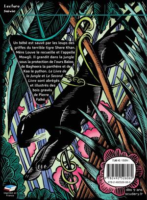 Édition abrégée du Livre de la Jungle et du Second Livre de la Jungle de Kipling, illustrée de très nombreux bois gravés : dans la Jungle indienne, un bébé d’hommes est sauvé par les loups des griffes du terrible tigre Shere Khan. Mère Louve le recueille et l’appelle Mowgli. Il grandit dans la jungle sous la protection de l'ours Baloo, de Bagheera la panthère et de Kaa le python. Suivez les véritables aventures de Mowgli dans cette exceptionnelle édition, fidèle au récit de Kipling et adaptée pour les jeunes lecteurs. Le texte est illustré en couleurs par plus de 80 gravures sur bois coloriées de Pierre Falké.