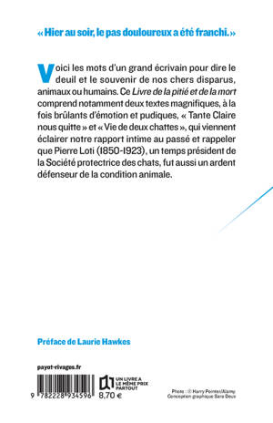 Voici les mots d'un grand écrivain pour dire le deuil et le souvenir de nos chers disparus, animaux ou humains. Ce Livre de la pitié et de la mort comprend notamment deux textes magnifiques, à la fois brûlants d'émotion et pudiques, « Tante Claire nous quitte » et « Vie de deux chattes », qui viennent éclairer notre rapport intime au passé et rappeler que Pierre Loti (1850-1923), un temps président de la Société protectrice des chats, fut aussi un ardent défenseur de la condition animale.