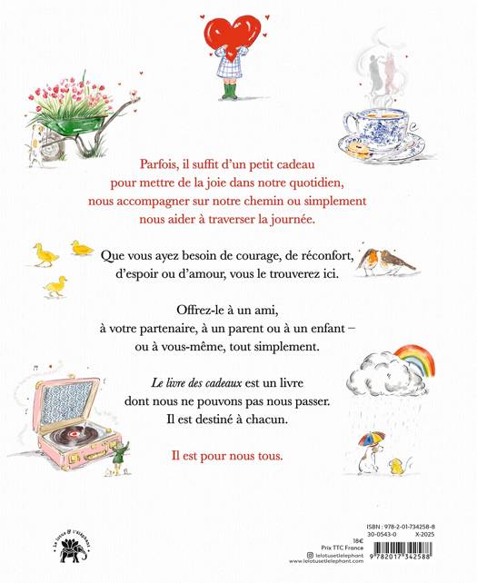 Que vous ayez besoin de courage, de réconfort, d’espoir ou d’amour, vous le trouverez ici. Offrez-le à un ami, à votre partenaire, à un parent ou à un enfant – ou à vous-même, tout simplement. Le livre des cadeaux est un livre dont nous ne pouvons pas nous passer. Il est destiné à chacun. Il est pour nous tous.