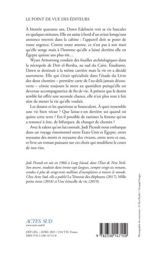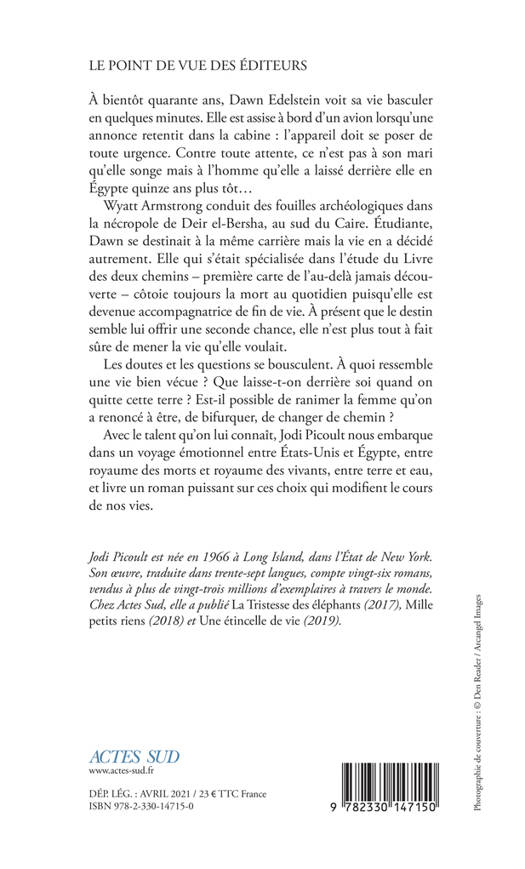 Avec le talent qu'on lui connaît, Jodi Picoult nous embarque dans un voyage émotionnel entre États-Unis et Égypte, entre royaume des morts et royaume des vivants, entre terre et eau, et livre un roman puissant sur ces choix qui modifient le cours de nos vies.