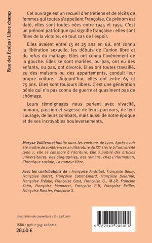 Cet ouvrage est un recueil d’entretiens et de récits de femmes qui toutes s’appellent Françoise. Ce prénom est daté, elles sont toutes nées entre 1945 et 1955. C’est un prénom patriotique qui signifie française : elles sont filles de la victoire, en tout cas de l’espoir. Elles avaient entre 15 et 25 ans en 68, ont connu la libération sexuelle, les débuts de l’union libre et du refus du mariage. Elles ont connu l’avènement de la gauche. Elles se sont mariées, ou pas, ont eu des enfants, ou pas, ont divorcé. Elles ont toutes travaillé, eu des maisons ou des appartements, conduit leur propre voiture... Aujourd’hui, elles ont entre 65 et 75 ans. Elles sont toujours libres. C’est une génération bénie qui n’a pas connu de guerre et quasiment pas de chômage. Leurs témoignages nous parlent avec vivacité, humour, passion et sagesse de leurs parcours, de leur courage, de leurs combats, mais aussi de notre époque et de ses incroyables bouleversements.
