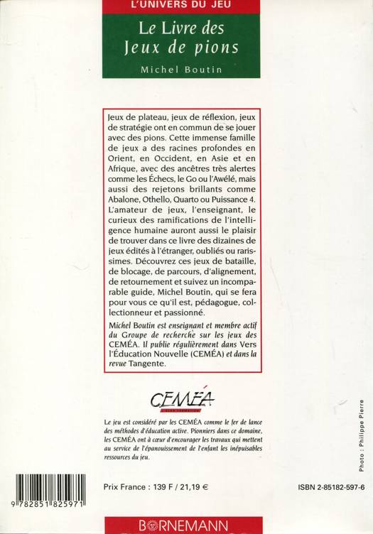 Jeux de plateau, jeux de réflexion, jeux de stratégie ont en commun de se jouer avec des pions. Cette immense famille de jeux a des racines profondes en Orient, en Occident, en Asie et en Afrique, avec des ancêtres très alertes comme les Echecs, le Go ou l'Awélé, mais aussi des rejetons brillants comme Abalone, Othello, Quarto ou Puissance 4. L'amateur de jeux, l'enseignant, le curieux des ramifications de l'intelligence humaine auront aussi le plaisir de trouver dans ce livre des dizaines de jeux édités à l'étranger, oubliés ou rarissimes. Découvrez ces jeux de bataille, de blocage, de parcours, d'alignement, de retournement et suivez un incomparable guide, Michel Boutin, qui se fera pour vous ce qu'il est, pédagogue, collectionneur et passionné.