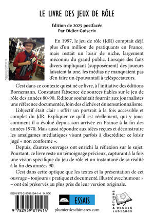 En 1997, le jeu de rôle (JdR) comptait déjà plus d’un million de pratiquants en France, mais restait un loisir de niche, largement méconnu du grand public. Lorsque des faits divers impliquant (supposément) des joueurs faisaient la une, les médias ne manquaient pas d’en faire un épouvantail à téléspectateurs. C’est dans ce contexte qu’est né ce livre, à l’initiative des éditions Bornemann. Constatant l’absence de sources fiables sur le jeu de rôle des années 80-90, l’éditeur souhaitait fournir aux journalistes une référence documentée, loin des clichés et du sensationnalisme. L’objectif était clair : offrir un portrait à la fois accessible et complet du JdR. Expliquer ce qu’il est réellement, qui y joue, comment il a évolué depuis son arrivée en France à la fin des années 1970. Mais aussi répondre aux idées reçues et déconstruire les amalgames médiatiques visant parfois à discréditer ce loisir jugé « non conforme ». Depuis, d’autres ouvrages ont enrichi la réflexion sur le sujet. Pourtant, ce livre reste un témoignage précieux, capturant à la fois une vision spécifique du jeu de rôle et un instantané de sa réalité à la fin des années 90. C’est dans cette optique que les textes et la présentation de cet ouvrage – toujours « pratique et documenté, illustré avec humour » – ont été préservés au plus près de leur version originale.
