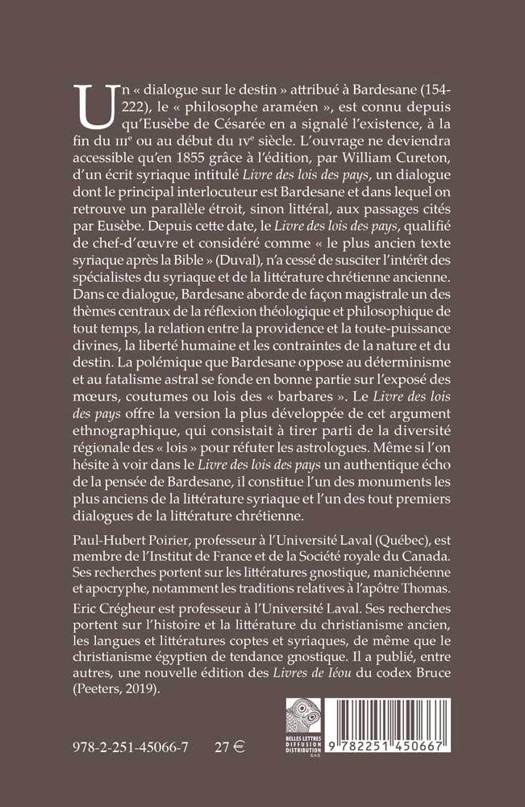 Un dialogue sur le destin attribue a Bardesane (154-222), le philosophe arameen , est connu depuis qu'Eusebe de Cesaree en a signale l'existence, a la fin du IIIe ou au debut du IVe siecle. L'ouvrage ne deviendra accessible qu'en 1855 grace a l'edition, par William Cureton, d'un ecrit syriaque intitule Livre des lois des pays, un dialogue dont le principal interlocuteur est Bardesane et dans lequel on retrouve un parallele etroit, sinon litteral, aux passages cites par Eusebe. Depuis cette date, le Livre des lois des pays, qualifie de chef-d'oeuvre et considere comme le plus ancien texte syriaque apres la Bible (Duval), n'a cesse de susciter l'interet des specialistes du syriaque et de la litterature chretienne ancienne. Dans ce dialogue, Bardesane aborde de facon magistrale un des themes centraux de la reflexion theologique et philosophique de tout temps, la relation entre la providence et la toute-puissance divines, la liberte humaine et les contraintes de la nature et du destin. La polemique que Bardesane oppose au determinisme et au fatalisme astral se fonde en bonne partie sur l'expose des moeurs, coutumes ou lois des barbares . Le Livre des lois des pays offre la version la plus developpee de cet argument ethnographique, qui consistait a tirer parti de la diversite regionale des lois pour refuter les astrologues. Meme si l'on hesite a voir dans le Livre des lois des pays un authentique echo de la pensee de Bardesane, il constitue l'un des monuments les plus anciens de la litterature syriaque et l'un des tout premiers dialogues de la litterature chretienne.
